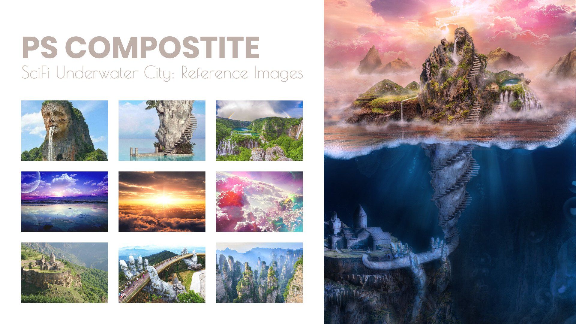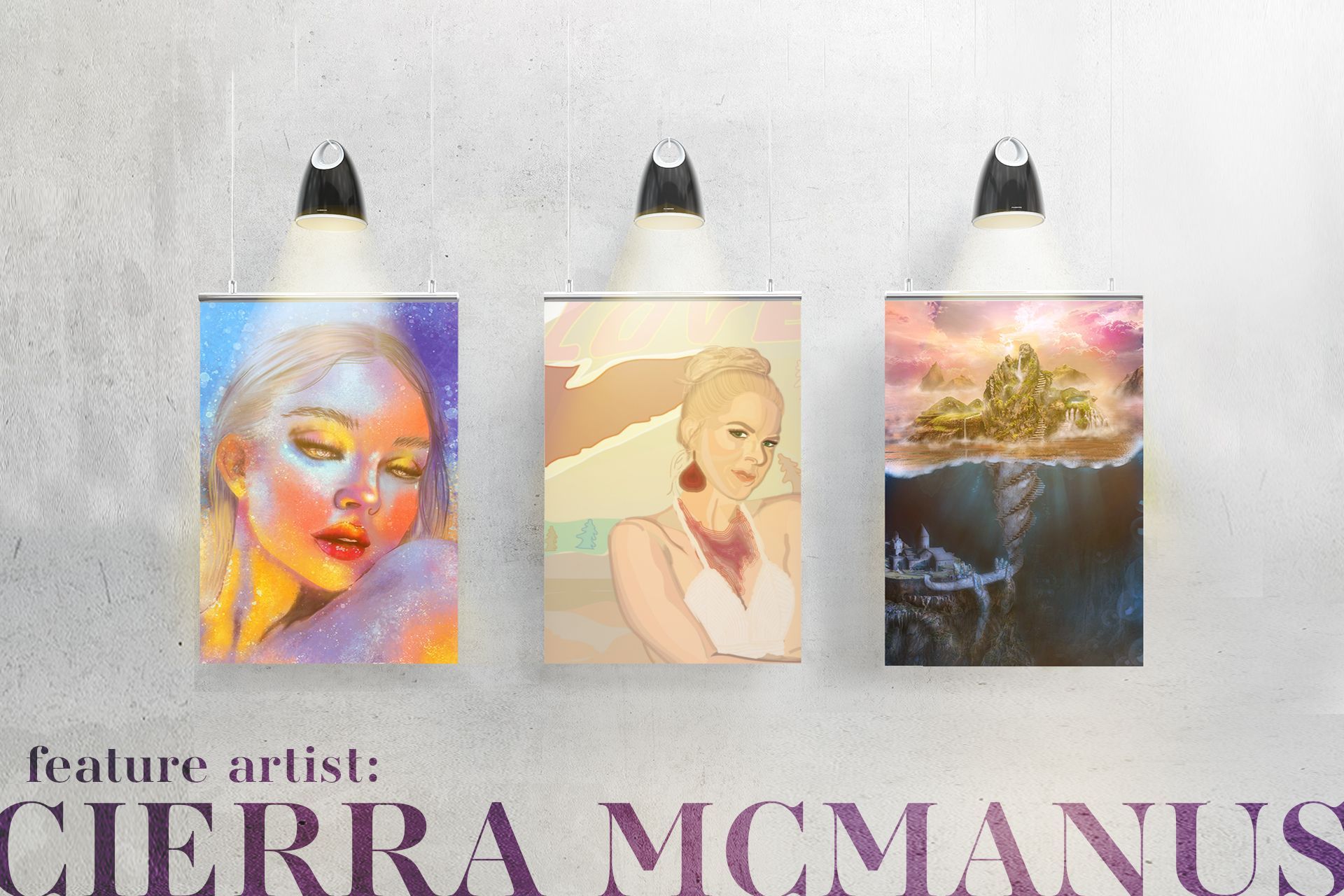 This project features a gallery collection of three digital paintings created while pursuing my Degree in Digital Arts. From left to right: “Imitation #1”, “Self Portrait”, and “A World Under A Wave”.