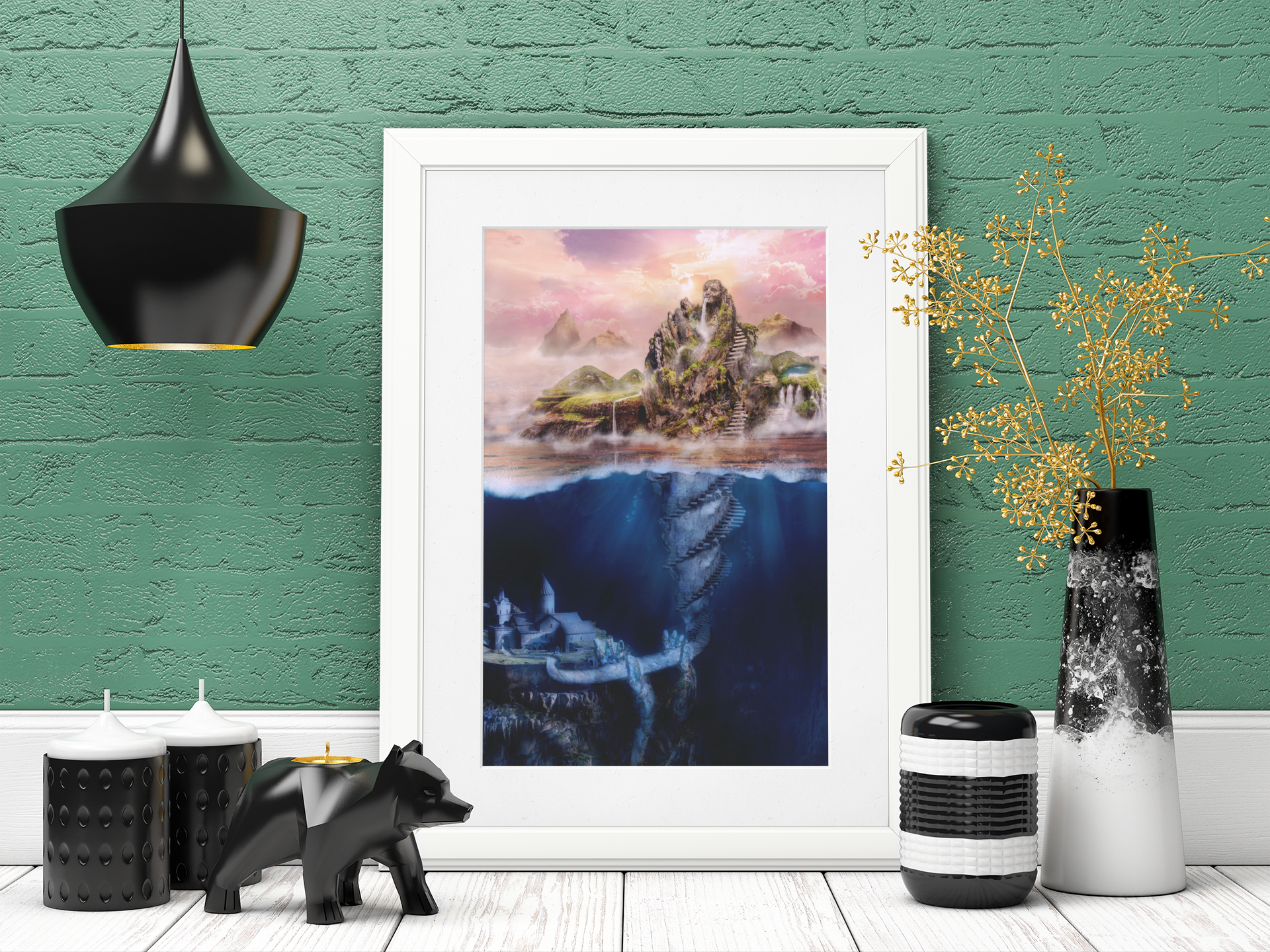 I have put these three projects under the same category because combined they illustrate my ability to balance imitation, reflection, and pure imagination in the form of Art for Arts sake. These projects demonstrate my capacity to move between different programs seamlessly to create beautiful one of a kind images. I can copy styles or create fully original artworks, depending on what the client needs. (This mock-up was created using Placeit.net and Photoshop)